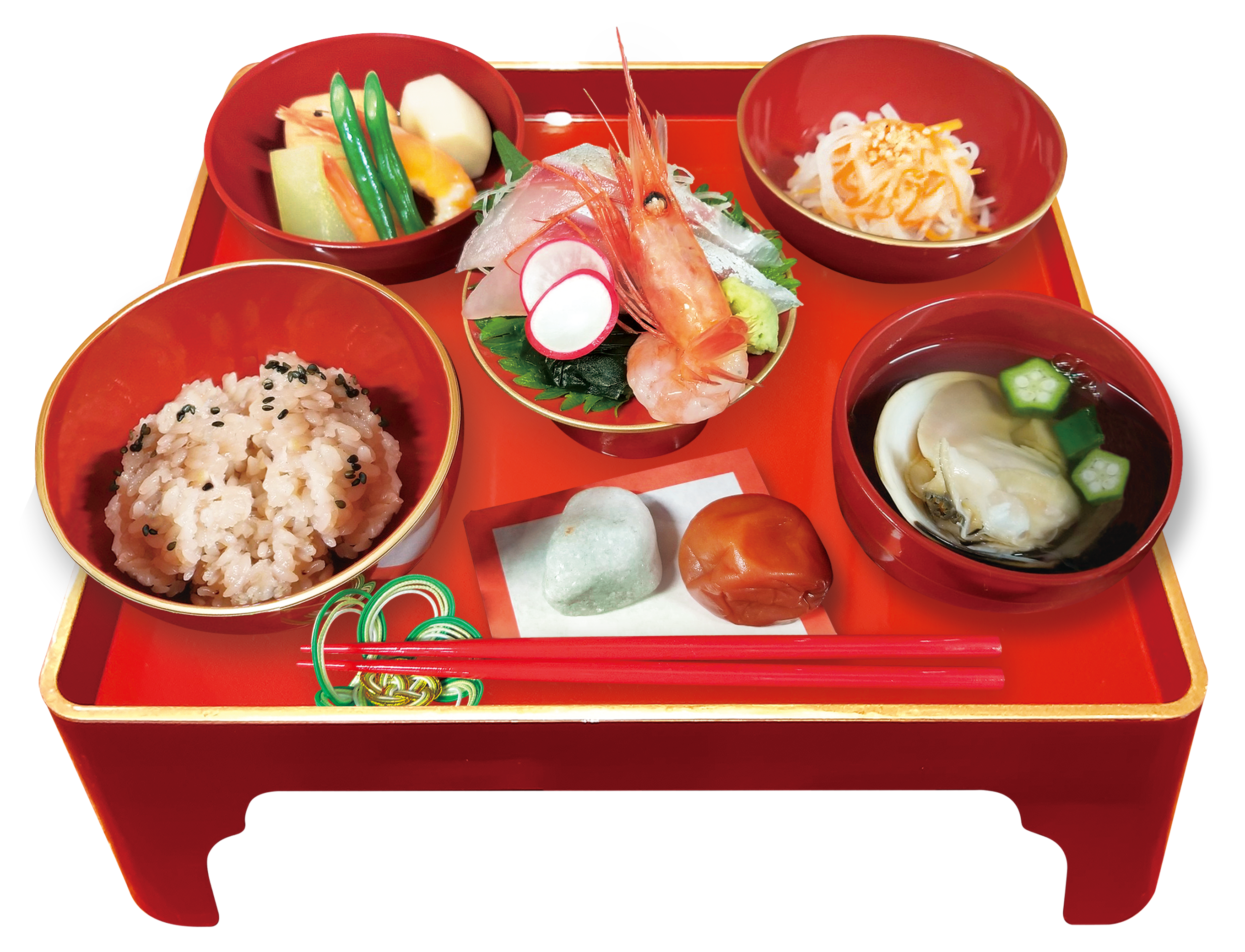 赤飯・鯛・煮物・香の物・汁物など、縁起の良い食材を丁寧に手仕込みで仕上げたお祝い膳をご用意しています。